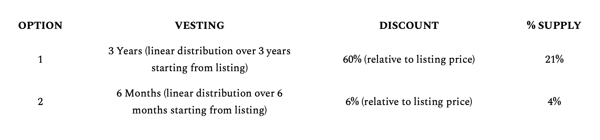 You can allocate your contribution between two options. Option 1 is the main event and includes most of the supply. It has longer vesting with a steeper discount.